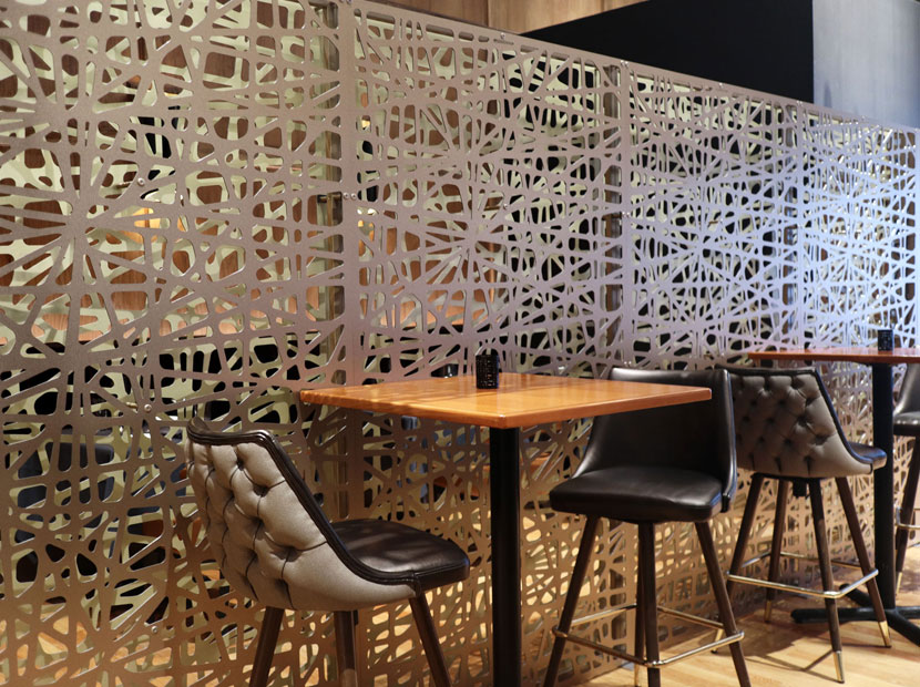 Architectural screen walls are made of decorative panels, supported by aluminum structure creating a light weight partition system. Free standing dividing screens consist of double layer Aluminum composite CNC panels and stainless steel floor plates designed for permanent use.